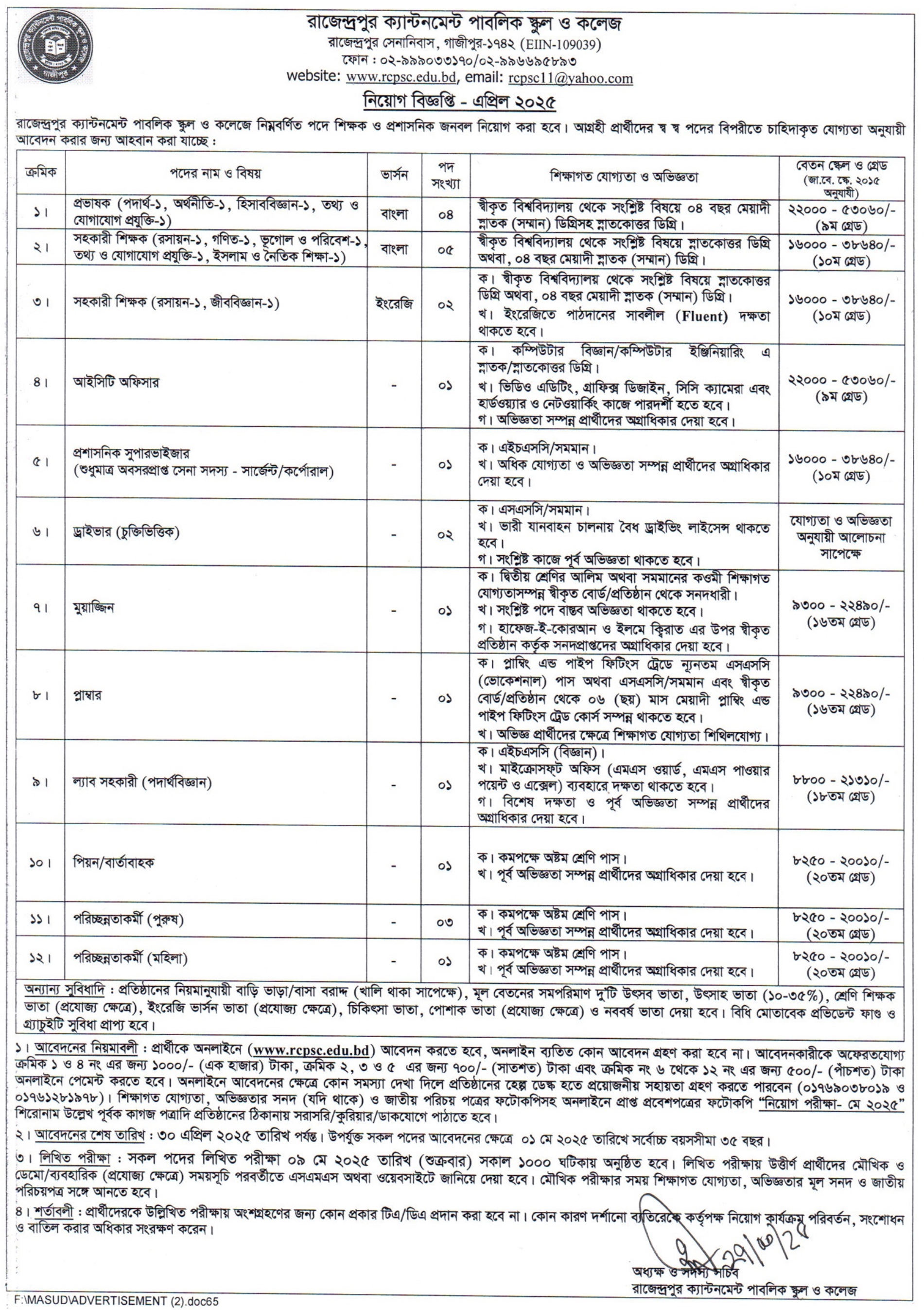 Rajendrapur Cantonment Public School & College Job Circular 2025